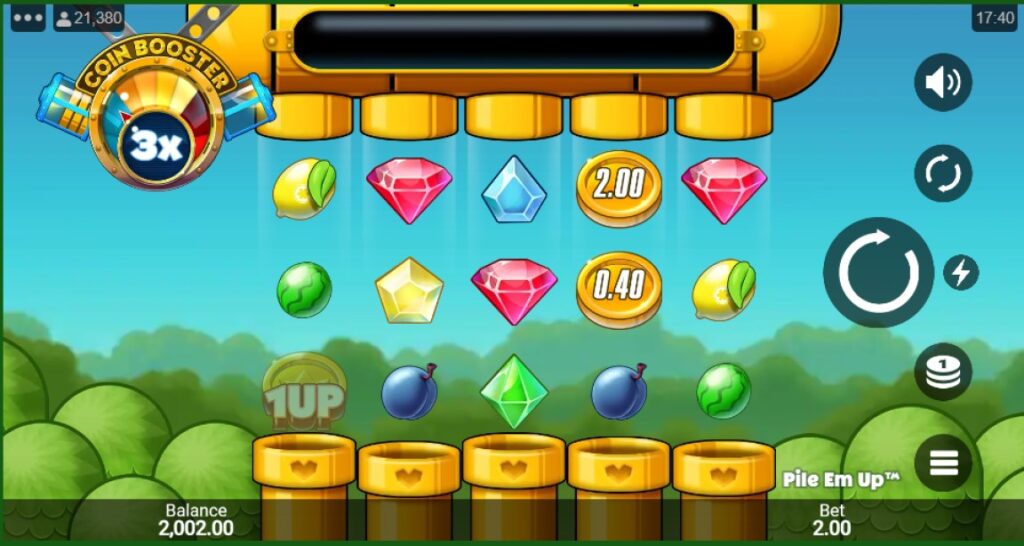 The Coin Booster begins with a 1x multiplier. Every time you hit a 1UP symbol it adds to the Coin Booster. You must collect gold coins which are multiplied by the booster value after you land the Collect symbol on reel five. Look out for wilds which can substitute for any regular symbols except scatters, bonus icons, and the 1UP.