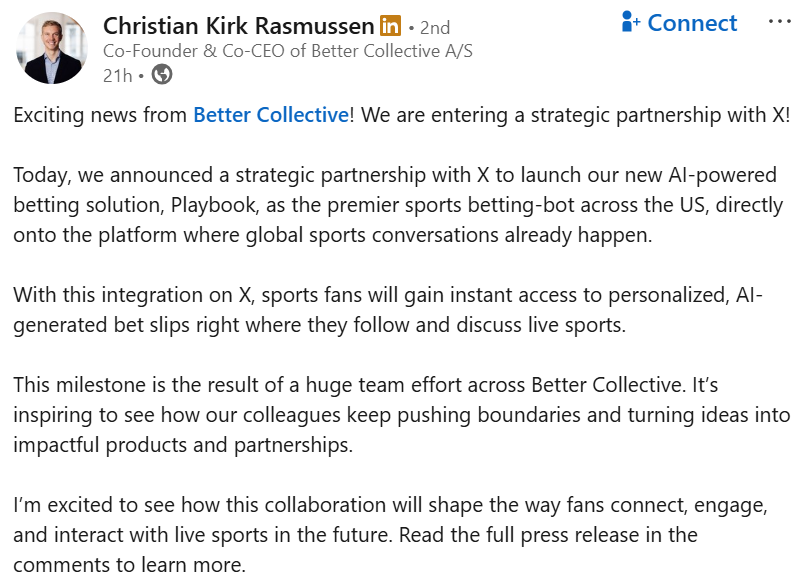 Fellow co-CEO Jesper Søgaard, Co-founder & Co-CEO of Better Collective said the tie-up will give sports fans “instant access to AI-generated betslips right where the global sports conversation happens.”