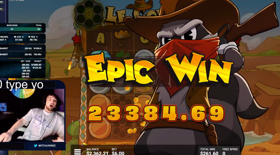 Summary: Mitch Jonez hit the big time this week thanks to a Hacksaw Gaming slot featuring a gun-wielding racoon… or maybe he’s a skunk, who knows? Either way, Mitch Jonez bagged $23,384.69 on Le Cowboy, hitting a multiplier of 3,897x to do just that. He couldn’t believe his luck at the major payday.