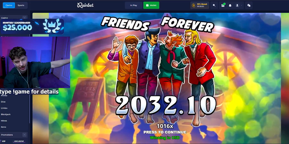 Summary: For our final win, we’re deviating from the usual slots to take you to the land of Limbo. This is an original crash game from Rainbet, on which the crypto casino’s partner Hunter hit it big this week. He was betting with tiny stakes when he managed to hit a multiplier of 4,483.45, returning him a total of $4,000. The streamer clearly couldn’t believe his luck, and his face shows it all.