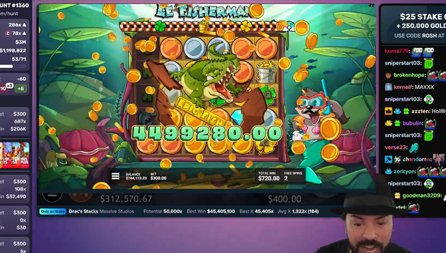 Summary: He is one of the most well-known names in the world of gambling streamers… that’s right, Roshtein is back this week with another incredible win. This time, that win came on Le Fisherman, a fishing-themed slot from Hacksaw Gaming. He managed to hit a multiplier win of 14,998x to turn his $300 stake into nearly $4.5m. It’s nowhere near his record win of $45.4m on Drac’s Stacks last year, but certainly not a bad day at the office.