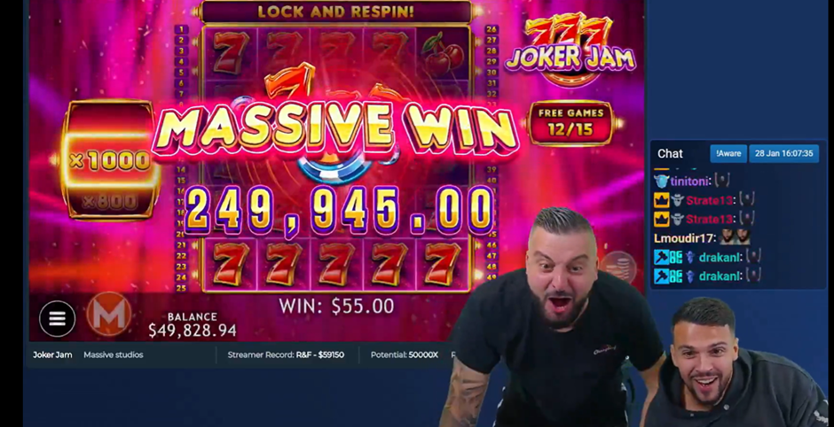 Summary: Our next high-paying game comes courtesy of Massive Studios. Joker Jam is a traditional-style slot with 7s and cherries galore. The Classy Beef boys decided to try their luck on it this week, playing with stakes of just $10 per spin. Georgi and Jonte went crazy when the win came up on screen, racking up to a total of $249,945.