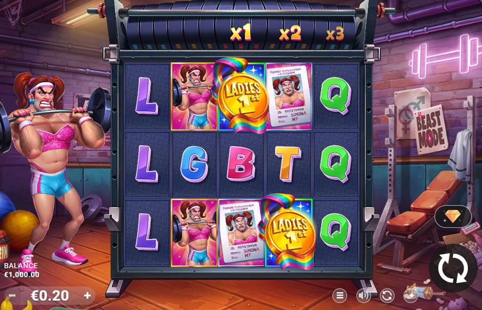 The game features masculine bodybuilders in feminine clothing and makeup competing in a women’s league. The reels feature the letters L, G, B, T, and Q and one of the mystery symbols is lingerie falling away to reveal the blurred genitalia of the athletes.