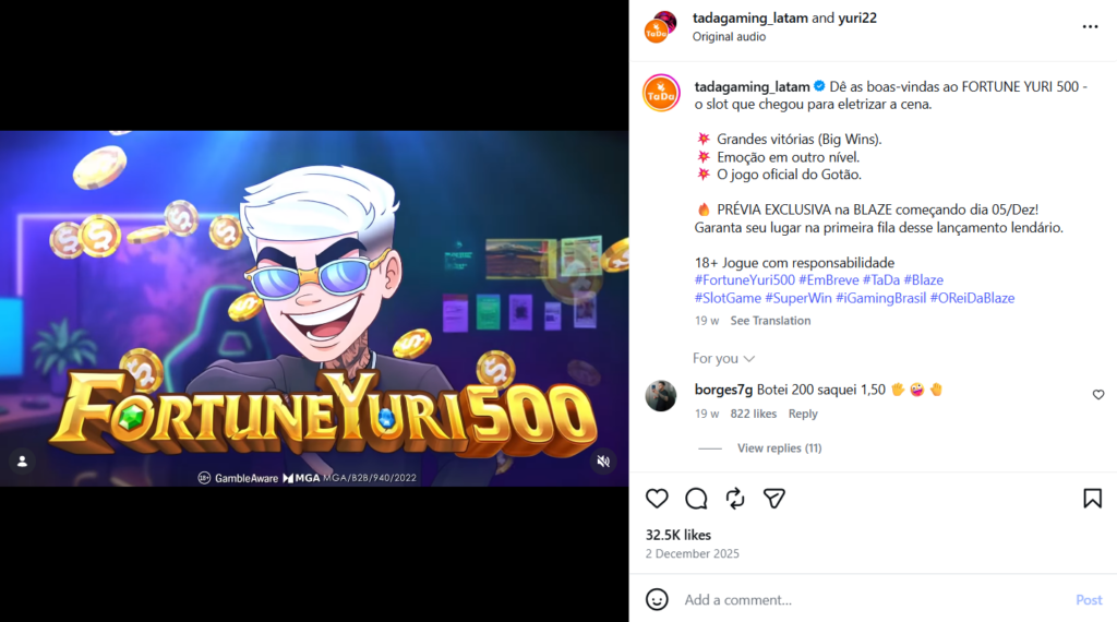 Langa’s declaration comes after Brazilian streamer Yuri Brida (@yuri22) in December launched his own TaDa Gaming slot Fortune Yuri 500, which the streamer shared on Instagram: