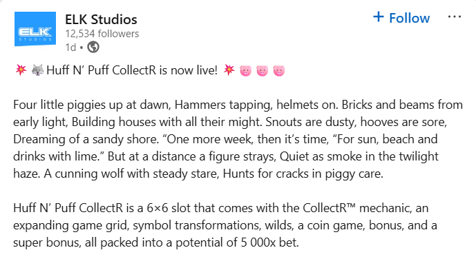 ELK dropped Huff N’ Puff CollectR on Thursday, with the slot’s title referencing the Swedish studio’s signature mechanic and its collaboration with L&W.