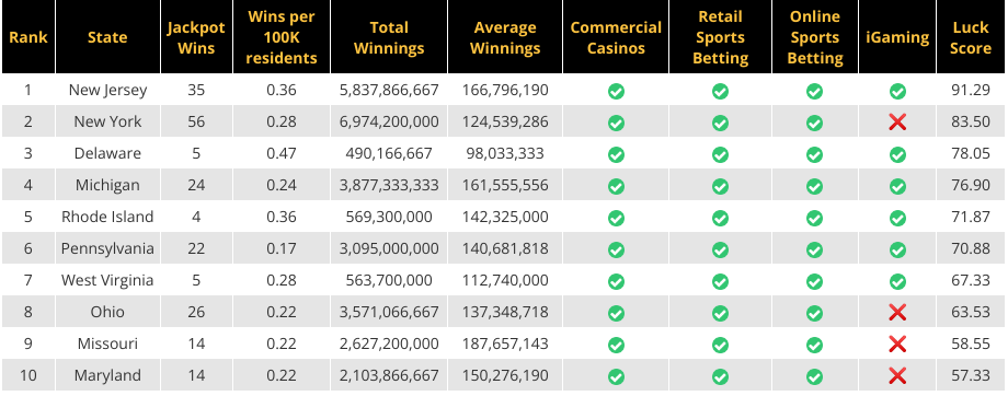 - New Jersey is the luckiest state in the US, topping the index thanks to frequent Powerball and Mega Millions wins and high historical jackpot values.