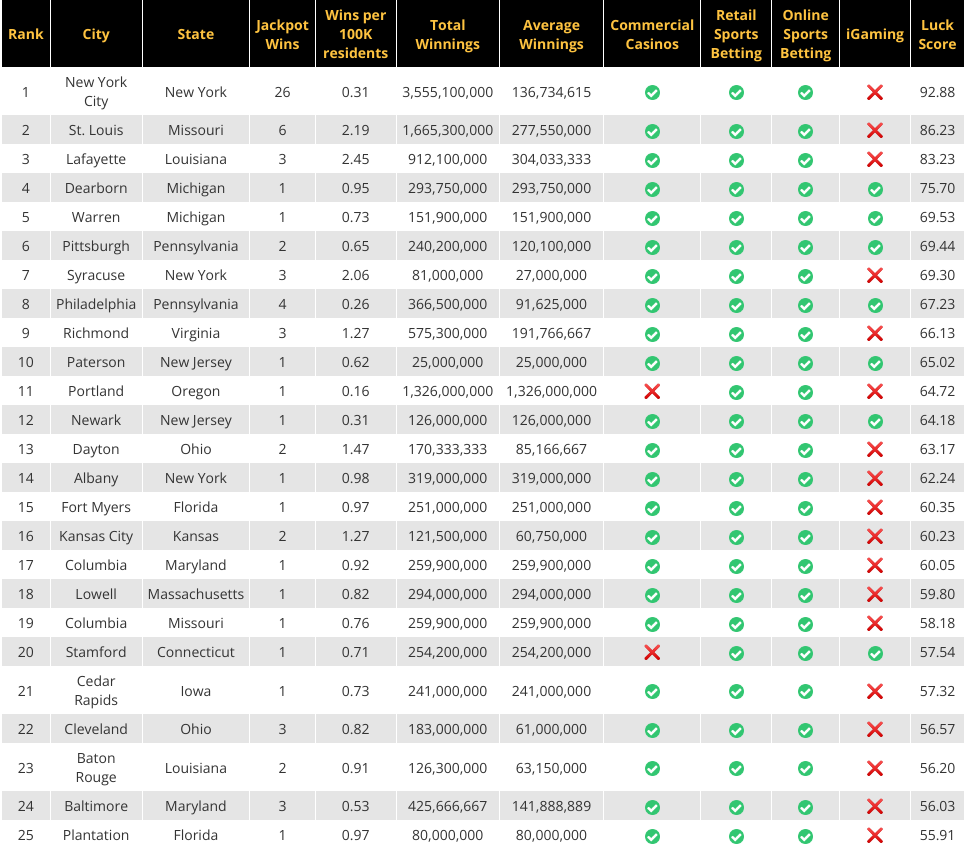 ranking states and major US cities by how often good fortune has struck