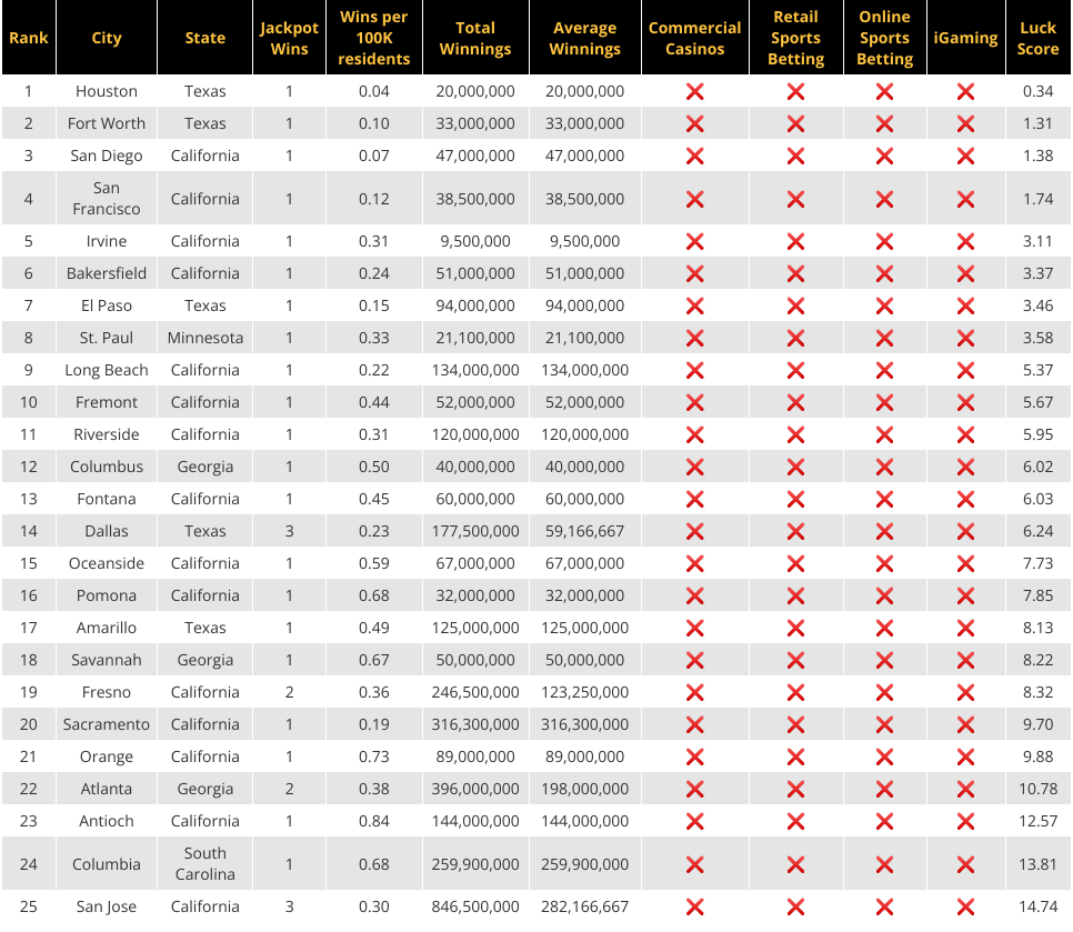 - At the other end of the scale, Houston, Fort Worth, San Diego, and San Francisco rank among the least lucky cities, largely due to a low number of wins relative to the size of their population.